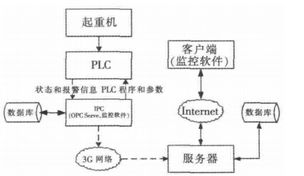 起重機(jī)安全監(jiān)控系統(tǒng)采用了無線接入、 現(xiàn)場總線、3G 技術(shù)及 OPC(OLE for Process Control)等先進(jìn)技術(shù) , 具有穩(wěn)定可靠、 功能全面、 界面友好、 可擴(kuò)展性強(qiáng)等優(yōu)點(diǎn)。 根據(jù)船廠起重機(jī)的特殊要求, 在現(xiàn)場采用現(xiàn)場總線技術(shù)將分布于設(shè)備上的傳感器、 監(jiān)控設(shè)備等連接起來,然后在現(xiàn)場實(shí)施實(shí)時(shí)監(jiān)控, 同時(shí)也可以通過 Internet 在遠(yuǎn)程客戶端對現(xiàn)場工況進(jìn)行實(shí)時(shí)監(jiān)控。 具體來說就是,在工業(yè)現(xiàn)場, 利用自主開發(fā)的監(jiān)控軟件采取現(xiàn)場起重機(jī)的運(yùn)行狀態(tài)信息和報(bào)警信息, 然后把信息儲存到現(xiàn)場數(shù)據(jù)庫(SQL Server)中。 通過 3G Router 將監(jiān)控信息發(fā)送到具有固定 IP 的中間服務(wù)器的數(shù)據(jù)庫(SQL Server)中, 遠(yuǎn)程客戶端利用客戶端監(jiān)控軟件讀取中間服務(wù)器中的數(shù)據(jù), 實(shí)現(xiàn)對現(xiàn)場的遠(yuǎn)程監(jiān)控。 一旦出現(xiàn)故障, 遠(yuǎn)程技術(shù)人員可以根據(jù)報(bào)警信息及時(shí)提出解決方案。